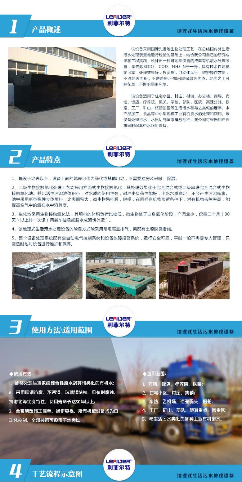 該設(shè)備采用國際先進的生物處理工藝,在總結(jié)國內(nèi)外生活污水處理裝置的運行經(jīng)驗基礎(chǔ)上,結(jié)合我公司自己的研究成果和工程實踐,設(shè)計出一種可地理設(shè)置的成套有機廢水處理裝置,集去除BOD5、COD、NH3于一身,具有技術(shù)性能穩(wěn)定,處理效果好,投資省,自動化運行,維護操作方便等特點