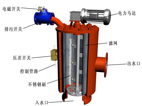 自清洗過濾器主要組件有:電機(jī)、電控箱、控制管路、主管組件、濾芯組件、316L不銹鋼刷、框架組件、傳動軸、進(jìn)出口連接法蘭等?!?/p>