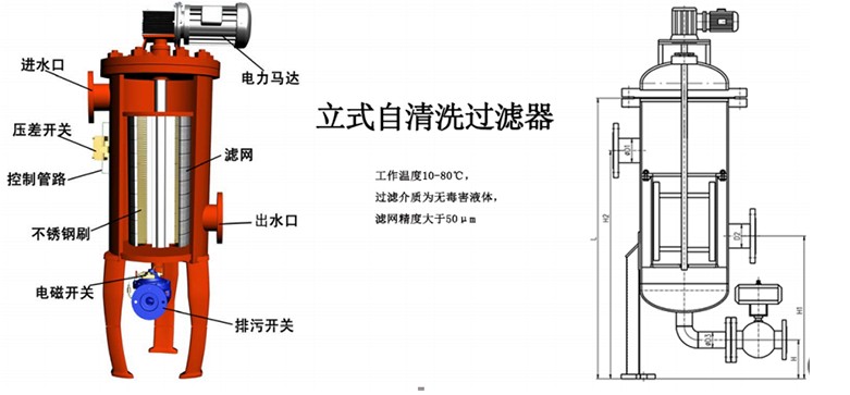 自清洗過濾器是一種利用濾網(wǎng)直接攔截液體中的雜質(zhì) ,漂浮物,顆粒物等,同時(shí)降低水的濁度,減少污垢,同時(shí)保障后面設(shè)備正常工作及使用壽命的精密設(shè)備,可有效的解決冷卻循環(huán)水系統(tǒng)中的雜志或因結(jié)垢生銹產(chǎn)生固體懸浮物,自清洗過濾器,運(yùn)行及控制不需外接任何能源就可以自動(dòng)清洗過濾,自動(dòng)排污。反沖洗期間不斷流,清洗過濾可以調(diào)節(jié),自清洗過濾時(shí)間默認(rèn)為10-60/s ,清洗過濾損失水量只占過濾水量的0.08 - 0.6% ;過濾精度可達(dá)10-3000微米;工作壓力可達(dá)1.0-1.6Mpa ;單臺(tái)流星: 4-4160m3/h??闪⑹?、臥式、倒置任意方向任意位置安裝。