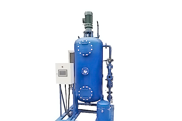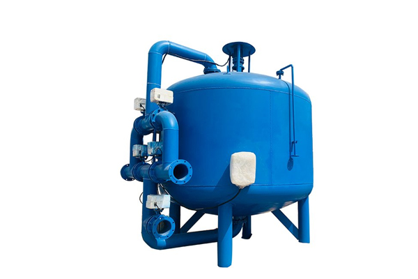 反洗狀態(tài): 隨著雜質(zhì)在填料層中不斷聚積, 內(nèi)部壓頭損失將不斷增大。當(dāng)進(jìn)、出水壓頭損失達(dá)到設(shè)定值時(shí),系統(tǒng)將自動激活定壓差裝置使其轉(zhuǎn)換至反洗狀態(tài),電機(jī)帶動攪拌器在罐體內(nèi)轉(zhuǎn)動,更便于清洗聚積起來的雜質(zhì)。當(dāng)系統(tǒng)處于反洗狀態(tài)時(shí),水的流向由底部向上流動,電機(jī)帶動攪拌器充分清洗濾料,由排污口直接流出。反洗后系統(tǒng)回復(fù)正常過濾狀態(tài).
