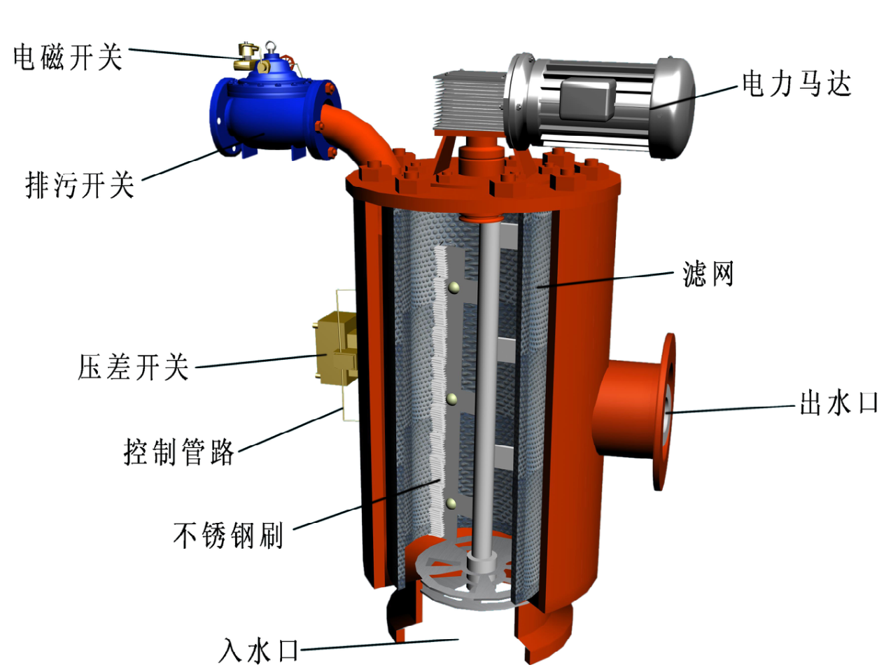 電動(dòng)刷式自清洗過濾器是輸送介質(zhì)管道上不可缺少的一種裝置。自清洗過濾器是一種利用濾網(wǎng)直接攔截水中的雜質(zhì),以凈化水質(zhì)及保護(hù)系統(tǒng)其他設(shè)備正常工作的精密設(shè)備,水由進(jìn)水口進(jìn)入自清洗過濾器機(jī)體, 由于智能化(PLC、PAC)設(shè)計(jì),系統(tǒng)可自動(dòng)識(shí)別雜質(zhì)沉積程度,給排污閥信號(hào)自動(dòng)排污。全自動(dòng)自清洗過濾器克服傳統(tǒng)過濾產(chǎn)品的納污量小、易受污物堵塞、過濾部分需拆卸清洗且無法監(jiān)控過濾器狀態(tài)等眾多缺點(diǎn),具有對(duì)原水進(jìn)行過濾并自動(dòng)對(duì)濾芯進(jìn)行自動(dòng)清洗排污的功能,且清洗排污時(shí)系統(tǒng)不間斷供水,可以監(jiān)控過濾器的工作狀態(tài),自動(dòng)化程度很高。通過對(duì)過濾器精度和流量的實(shí)驗(yàn)研究,開發(fā)出九大系列幾十種規(guī)格型號(hào),覆蓋了由10um到3000um的各種過濾精度的需求,為客戶提供各種水過濾設(shè)備。
