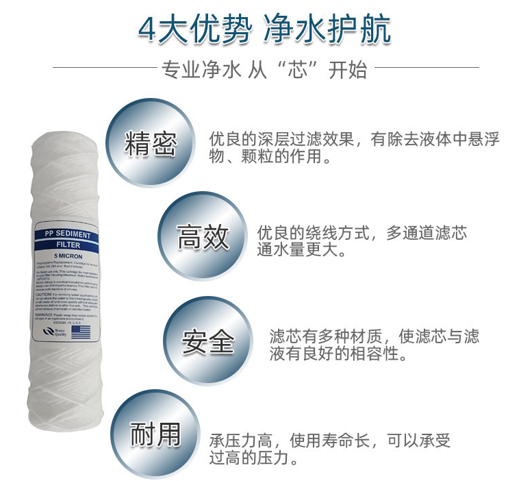 3. 線繞濾芯由不同多種材料制成,確保各種液體過濾要求,達(dá)到較佳過濾效果。