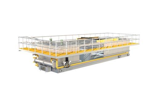 高效淺層氣浮系統(tǒng)是一個先進(jìn)的快速氣浮系統(tǒng),改傳統(tǒng)氣浮的靜態(tài)進(jìn)水、動態(tài)出水為動態(tài)進(jìn)水、靜態(tài)出水,即把含有附有微氣泡懸浮顆粒的混合污水進(jìn)入氣浮池內(nèi)的時候,使出流裝置移動,混合廢水的水平流速相對出流裝置為零,從而抑制了槽內(nèi)的紊流,因而能進(jìn)行平穩(wěn)的氣浮分離(即所謂的“零速度原理”),浮選體上升速度達(dá)到或接近理論升速,極大地提高了處理效率,使廢水在淺層氣浮槽中的停留時間由傳統(tǒng)的30~60 min減至3 min,并且集凝聚、撇渣、排水、排泥為一體,是一種高效的廢水處理裝置。