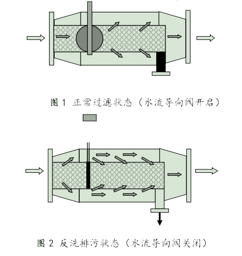 液體從濾網(wǎng)內(nèi)側(cè)流向外側(cè)過程中,固體顆粒被截留在濾網(wǎng)內(nèi)側(cè)。隨著污染物的增多,過濾器污染側(cè)和清潔側(cè)之間的壓差也逐漸增大。當(dāng)壓差達(dá)到設(shè)定值時(shí),壓差表發(fā)訊,過濾器開始自動(dòng)反沖洗工作過程。電動(dòng)控制閥門關(guān)閉,濾網(wǎng)內(nèi)外形成負(fù)壓,在壓力差的作用下,清潔側(cè)液流從被清洗濾網(wǎng)的外側(cè)流向內(nèi)側(cè),進(jìn)行反沖洗,聚積在濾網(wǎng)內(nèi)側(cè)的污染物被沖掉并通過排污口排出過濾器;如圖所示