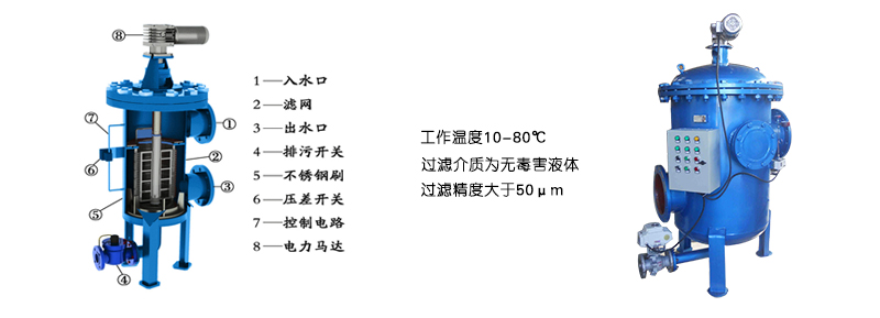 立式不銹鋼刷式自清洗過濾器當(dāng)水從進(jìn)水口進(jìn)入過濾器濾筒內(nèi)部,雜質(zhì)被攔截在過濾筒內(nèi)壁,過濾后的干凈水從出水口流出,當(dāng)濾筒內(nèi)壁的雜質(zhì)越積越多時(shí),過濾器進(jìn)出口的壓差達(dá)到預(yù)設(shè)值或達(dá)到清洗時(shí)間或手動(dòng)控制時(shí),過濾器將開始自清洗整個(gè)自清洗過程包含兩個(gè)步驟:打開位于過濾器上的自動(dòng)排污閥;電機(jī)帶動(dòng)過濾器濾網(wǎng)內(nèi)的清洗刷,被濾網(wǎng)所攔截下來的雜質(zhì)從排污閥排出。清洗時(shí)系統(tǒng)不斷流,過濾器的整個(gè)運(yùn)行過程由隨機(jī)配備的一個(gè)智能控制箱來控制,控制方式可選壓差、時(shí)間、手動(dòng)及PLC控制;結(jié)構(gòu)示意圖如下: