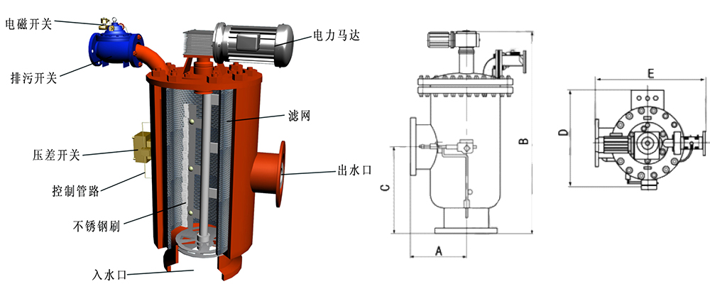 直通式自清洗過濾器主要由:筒體、電機(jī)不銹鋼網(wǎng)、鋼刷、及電器控制部分組成,其工作原理與其他形式自清洗原理相同,污水從進(jìn)水口進(jìn)入過濾器濾筒內(nèi)部,雜質(zhì)被攔截在過濾筒內(nèi)壁,過濾后的干凈水從出水口流出,當(dāng)濾筒內(nèi)壁的雜質(zhì)越積越多時(shí),過濾器進(jìn)出水口的壓差達(dá)到預(yù)設(shè)值或達(dá)到清洗時(shí)間或手動預(yù)制時(shí),過濾器將開始自清洗過濾器,整個(gè)字清晰過程包括兩個(gè)步驟:打開位于過濾器上的自動排污閥;電機(jī)帶動過濾器濾網(wǎng)內(nèi)的清洗刷,被濾網(wǎng)所攔截下來的雜質(zhì)從排污閥排出。清洗時(shí)系統(tǒng)不斷流,過濾器的整個(gè)運(yùn)行過程有隨機(jī)配備的一個(gè)智能控制箱來控制。結(jié)構(gòu)示意圖如下: